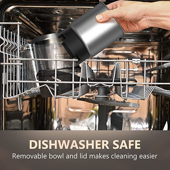 Easy Cleaning: The electric coffee grinder has a dishwasher-safe removable grinding cup. With the removable bowl, you can say goodbye to messes. Note: Only the stainless steel bowl and the clear lid are dishwasher-safe