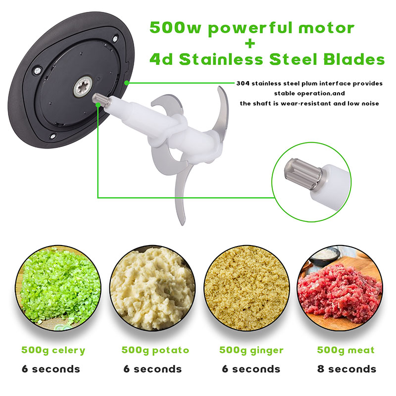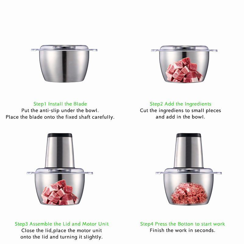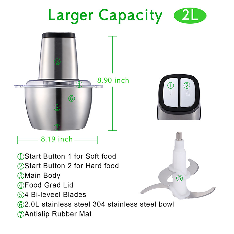 With 2 speeds & 4 sharp blades, Perfect 2L capacity 304 stainless steel bowl, overheat protection function, Easy to operate with a detachable knife assembly structure and easy to clean